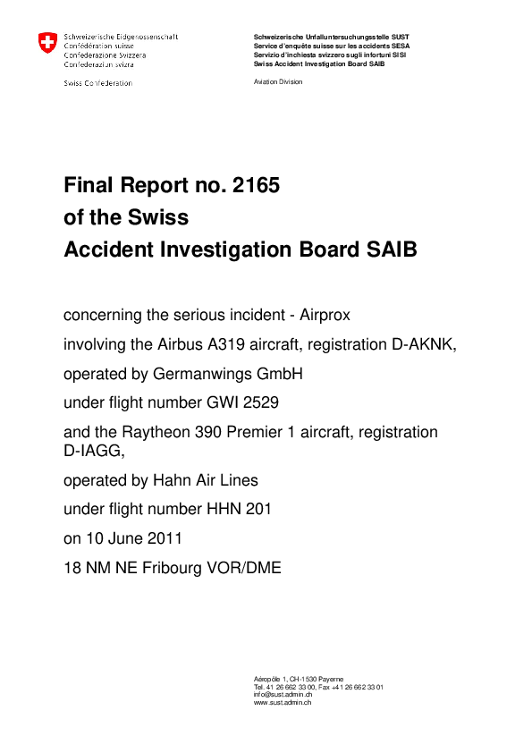 Final Report no. 2165, loss of separation between A319 and PRM1, near Fribourg Switzerland, 10 June