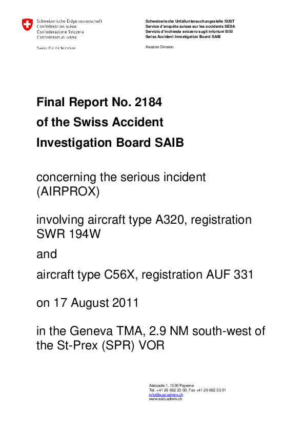 Final Report No. 2184, Loss of separation between A320 and C56X, Geneva Switzerland, 17 Aug, 2012