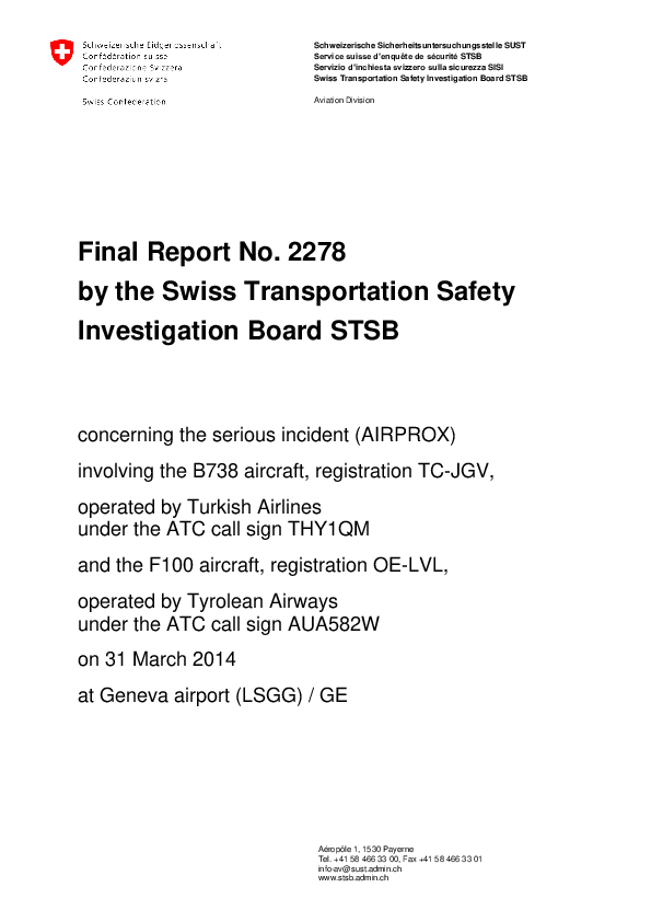 Final Report No. 2278 AIRPROX B738 (TC-JGV) & F100 (OE-LVL) Geneva Switzerland, 31 Mar 2014