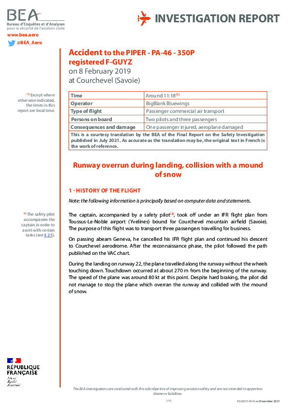 On 8 February 2019, a Piper PA46-350P overran the landing runway at Courchevel and collided with a mound of snow which caused significant damage to the aircraft but only one minor injury to a passenger. The Investigation noted that the experience of the Captain was inadequate but the investigation effort was primarily focused on the risk which had resulted from a commercial air transport flight being conducted without complying with the appropriate regulatory requirements for such flights and without either the passengers involved or the State Safety Regulator being aware of this.