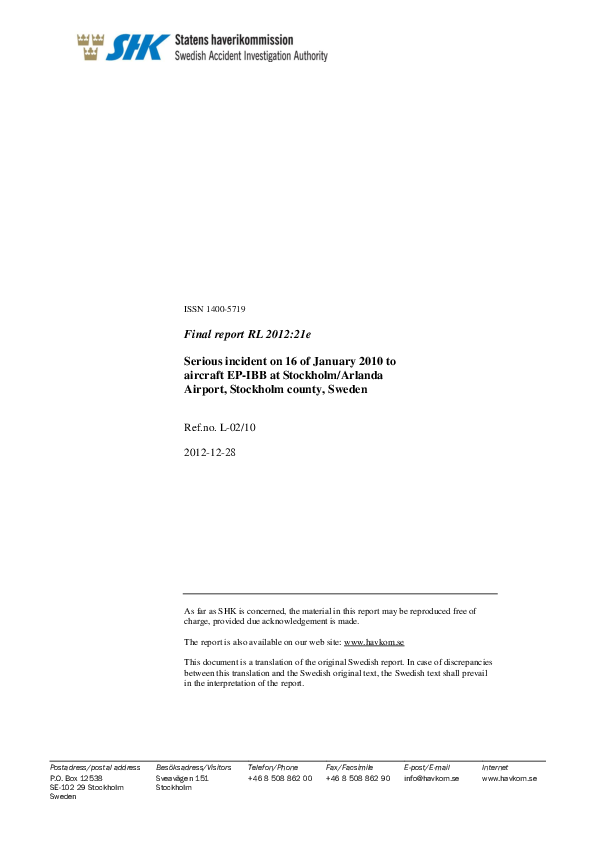 Final report RL 2012:21e, A306 Runway excursion, Stockholm Seden, 16 Jan 2010