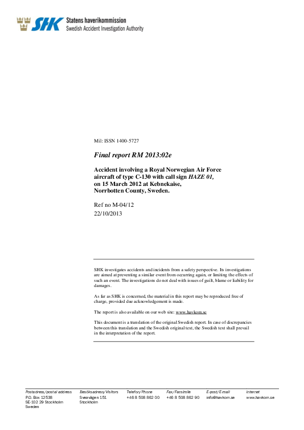 Final report RM 2013:02e, C30J CFIT, northern Sweden, 15 March 2012