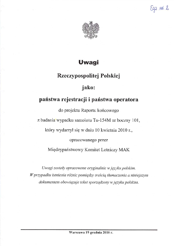 Official Polish comment, iaw ICAO Annex 13, on the Final Report by MAK (Russian Federation) into the accident involving a Polish air force Tu-154 on 10 April 2010 near Smolensk, Russian Federation.