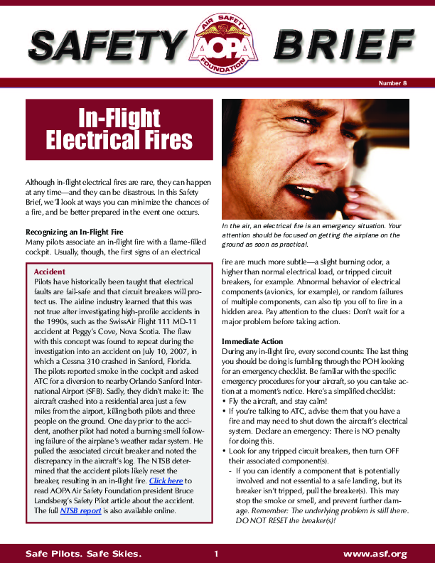 Although in-flight electrical fires are rare, they can happen at any time and they can be disastrous. This Safety Brief looks at ways one can minimize the chances of a fire, and be better prepared in the event one occurs.