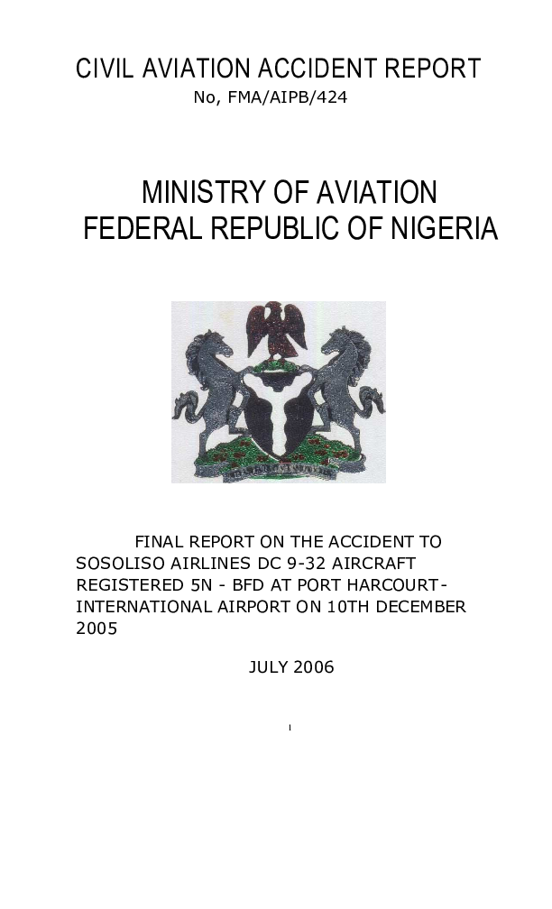 On 10 December 2005, a Douglas DC9-32 operated by Sosoliso Airlines descended below the ILS Decision Altitude without visual reference, on approach to Port Harcourt Nigeria, and control was lost during the attempted initiation of a go around, followed by ground impact and post crash fire.
