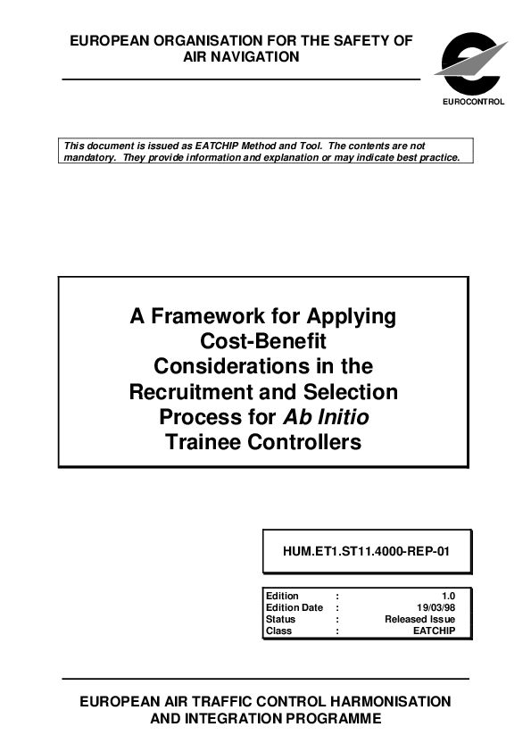 This report describes a methodological framework which can be used to carry out a Cost-Benefit Analysis (CBA) of the recruitment and selection process for ab initio trainee controllers. It is intended to be of practical use to National Administrations when making out a business case to support the introduction of enhanced recruitment and selection systems.