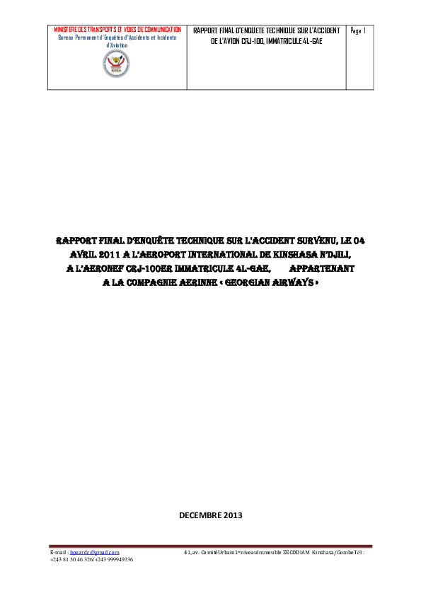 (French) Accident Report CRJ1, loss of control, Kinshasa Congo, 4 Apr. 2011