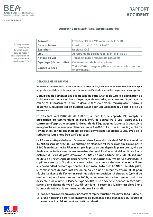 (French) Accident Report, E145 Unstabilised approach and hard landing, Ljubliana Slovenia, 24 May 20