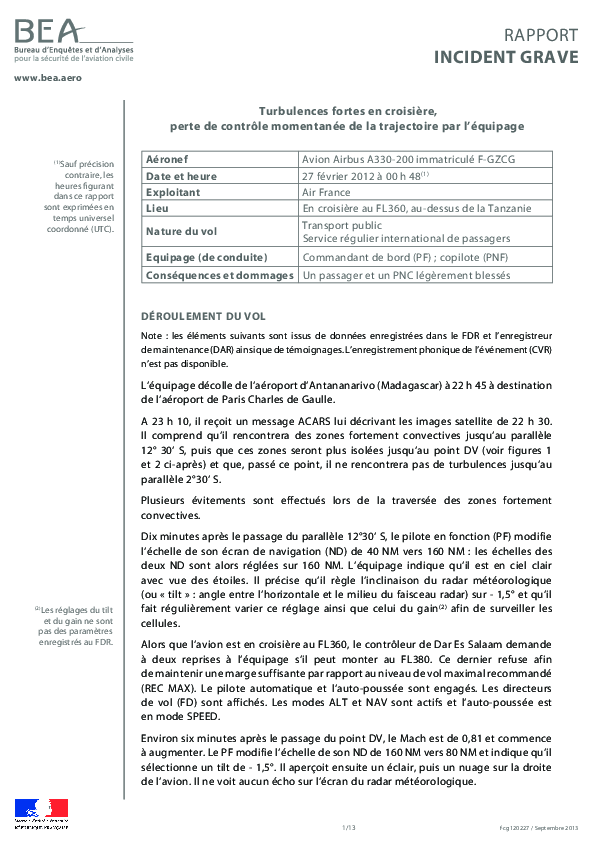 On 27 February 2012, an Air France Airbus A330 en route at night at FL360 and crossing the East African coast northbound at FL360 encountered sudden violent turbulence unanticipated by the flight crew and control of the aircraft was briefly lost with two minor injuries to occupants. The Investigation concluded that a rapidly developing and isolated convective cell had not been detected because of failure to make proper use of the weather radar, but noted that the actions of the crew to recover control had been appropriate and that the aircraft had remained during its flight envelope throughout.