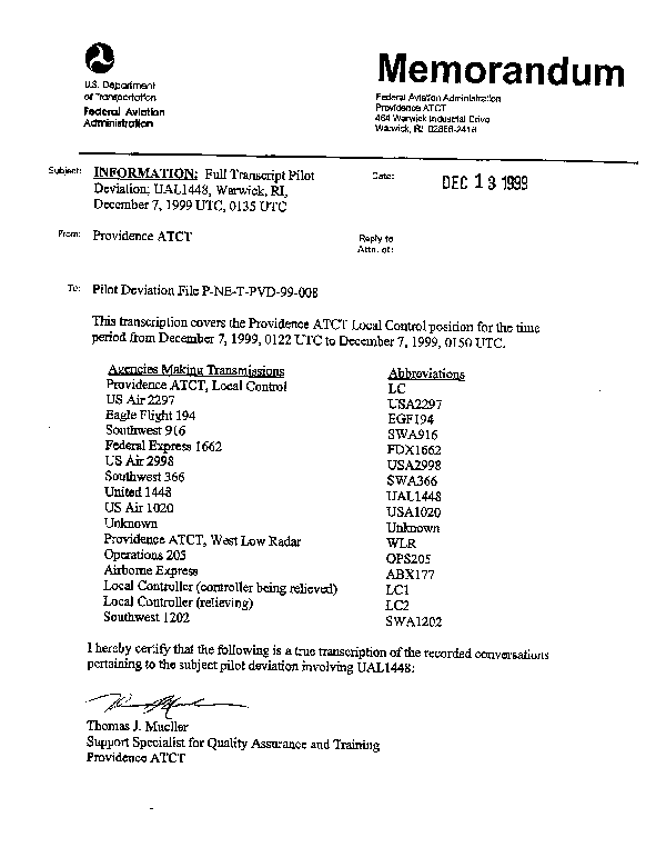 Full transcript pilot deviation, UAL1448, Warwick RI, December 7, 1999
