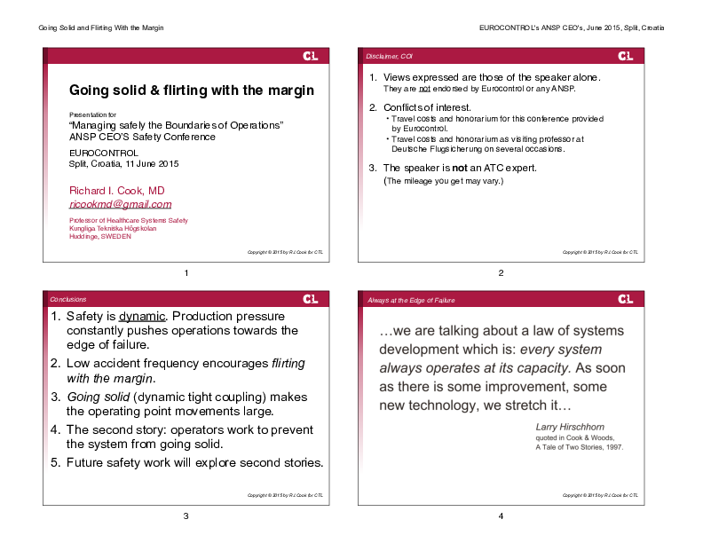 This presentation by Richard Cook held at EUROCONTROL ANSP's CEO Conference focuses on managing safely the boundaries of operations. As safety is dynamic, production pressure constantly pushes operations towards edge of failure and low accident frequency encourages flirting with the margin. Where is this margin ?