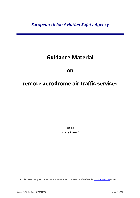 Issue 3. This document provides guidance to support both: - organisations (e.g. air traffic service providers, aerodrome operators) implementing, or considering to implement remote aerodrome ATS; and - the competent authorities in charge of the approval of remote aerodrome ATS implementation. This document also describes the general concept of remote aerodrome ATS to the ATM community by establishing a common baseline and understanding thereof. In addition, it provides clarification about and consistency with related terms and definitions. The document lists areas and issues for consideration when implementing remote aerodrome ATS, in particular those related to safety and human factors.