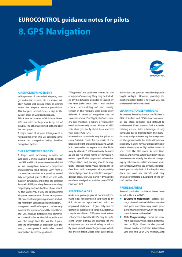 This is the eight of a series of Guidance Notes (GN) intended to help GA pilots avoid infringement of controlled airspace. The key points of GN 8 are Characteristics of GPS, Selecting a GPS, Learning to Use Your GPS, Problem Areas, Using GPS as Navigation Back-up and Hints from Experience.