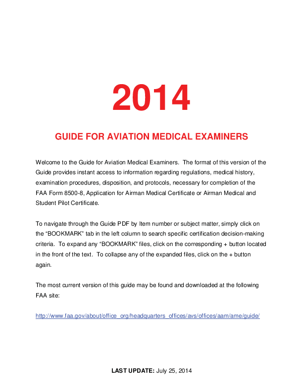 This version of the Guide provides instant access to information regarding regulations, medical history, examination procedures, disposition, and protocols, necessary for completion of the FAA Form 8500-8, Application for Airman Medical Certificate or Airman Medical and Student Pilot Certificate.