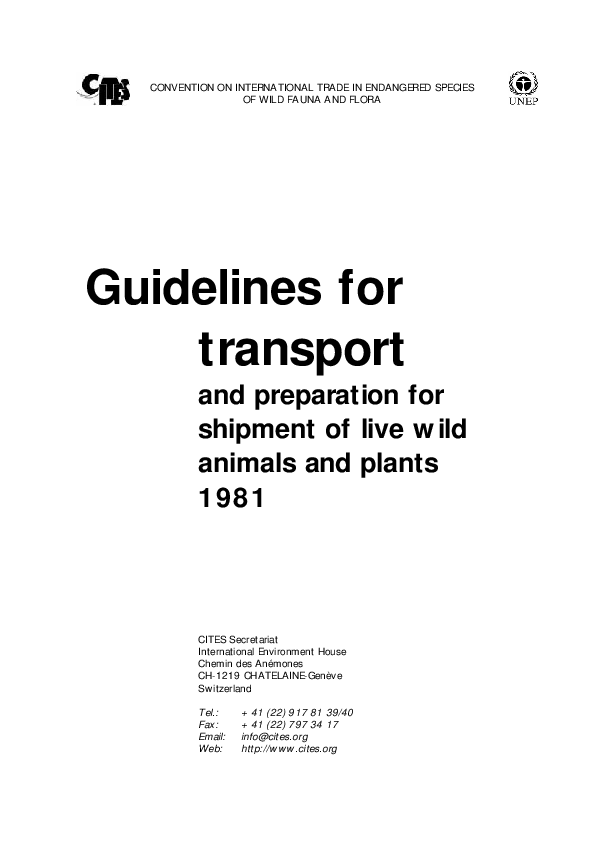 The guidelines for transport of animals comprise two parts. The first is intended for shipping agents, airline staff, ships personnel, railway staff and any others who may be involved in the handling and checking of live animal consignments. It consists of a three part advice to carriers, covering various aspects of the animals welfare, transport arrangements and the design and construction of containers. The second section is intended for such person or persons who are directly responsible for providing the containers and for making the advance arrangements for the transport of wild animals. This section consists of 18 packer's guidelines covering different groupings of animals.