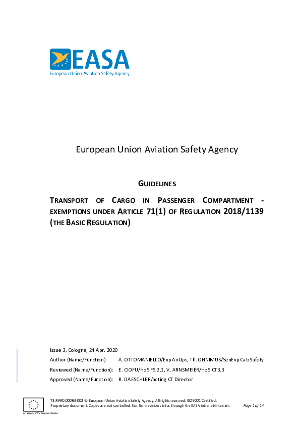 The purpose of this document is to provide guidelines for national competent authorities (NCAs) to consider when granting exemptions under Art. 71(1) of Regulation (EU) 2018/1139 (hereinafter, the Basic Regulation) allowing the Transport of Cargo in Passenger Compartments, during the current COVID-19 outbreak.