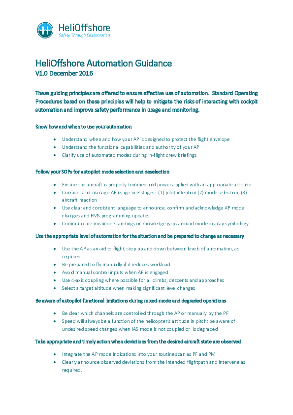 These guiding principles are offered to ensure effective use of automation. Standard Operating Procedures based on these principles will help to mitigate the risks of interacting with cockpit automation and improve safety performance in usage and monitoring.