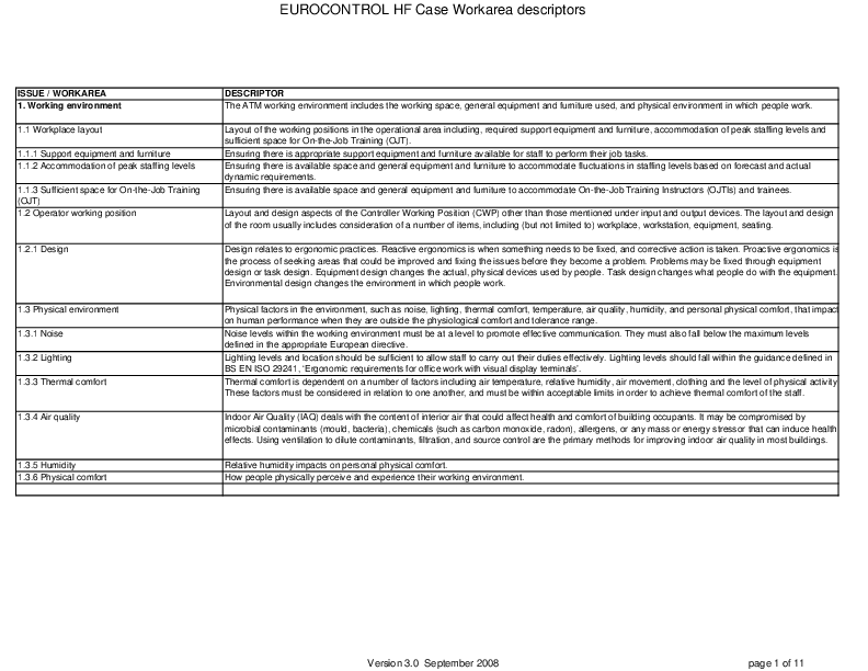 WORKAREA DESCRIPTORs: 1. Working environment 2. Organisation and Staffing 3. Procedures, Roles and Responsibilities 4. Training and development 5. Teams and communication 6. Human in System