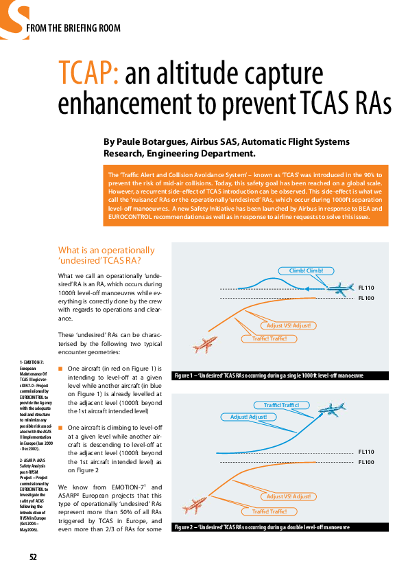 A recurrent side-effect of TCAS is what we call the ‘nuisance’ RAs or the operationally ‘undesired’ RAs, which occur during 1000ft separation level-off manoeuvres. A new Safety initiative has been launched by Airbus in response to BEA and EUROCONTROL recommendations as well as in response to airline requests to solve this issue.