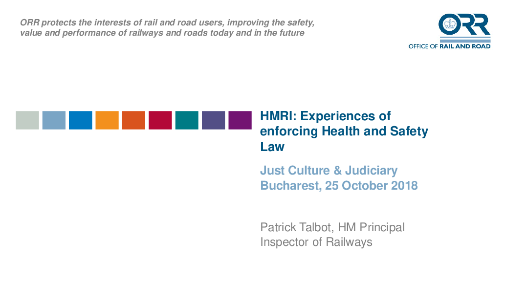 This presentation deals with the health and safety law in Great Britain, experiences of enforcing health and safety law and also with HM (Her Majesty) Railway Inspectorate.