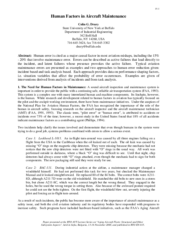 Human error is cited as a major causal factor in most aviation mishaps, including the 15% - 20% that involve maintenance error. Errors can be described as active failures that lead directly to the incident, and latent failures whose presence provokes the active failure. Typical aviation maintenance errors are presented as examples and two approaches to human error reduction given: incident based and task analysis based. Each approach provides data on performance shaping factors, i.e. situation variables that affect the probability of error occurrences. Examples are given of interventions derived from analysis of incidents and from task analysis.