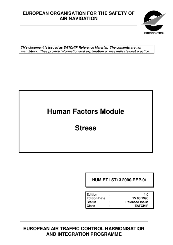 This document describes the sources for stress, human reactions to stress and human perception of stress. The module further defines prevention & coping techniques, prevention in terms of selection, training, jobdesign, medical checks, attitudes and behaviour and coping in terms of recognition, food, exercise and relaxation techniques.