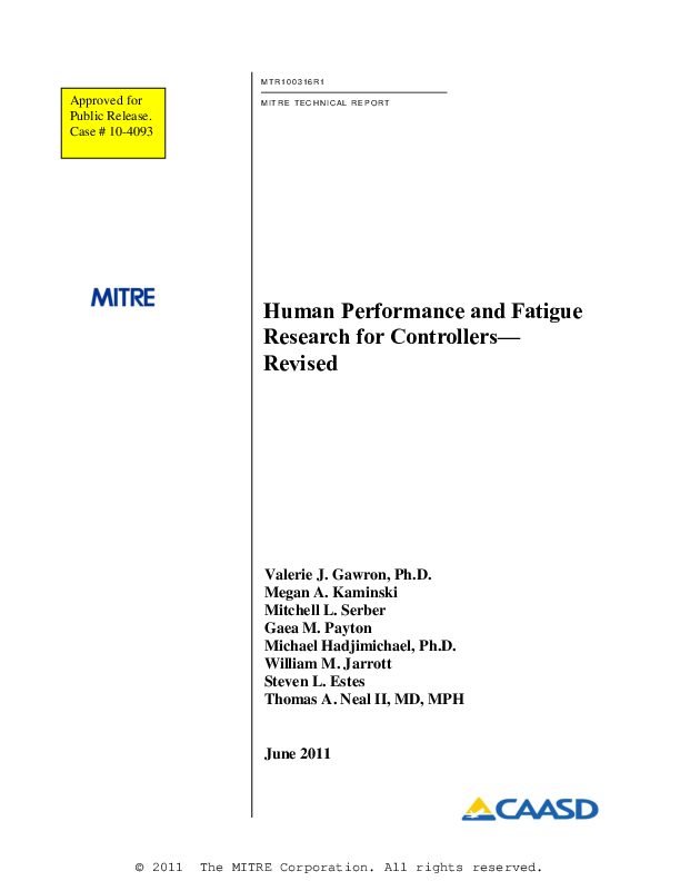 Human Performance and Fatigue Research for Controllers - MITRE Technical Report 100316