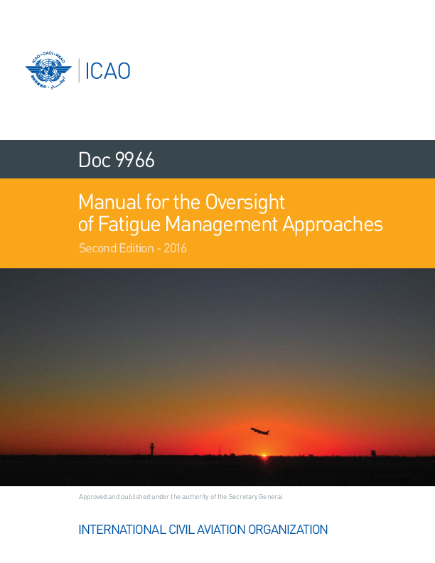 The Manual for the Oversight of Fatigue Management Approaches (Doc 9966) is one in a suite of Manuals related to fatigue management. Developed for States, it presents an overview on the oversight of fatigue management approaches in general.
