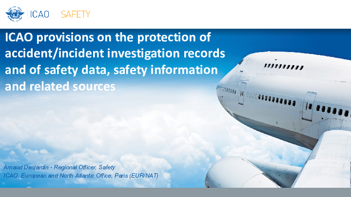 This presentation shows the ICAO provisions on the protection of\r\naccident/incident investigation records and of safety data, safety information\r\nand related sources.