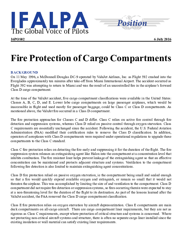 A document describing IFALPA's position on fire protection of cargo compartments, the main point being Class D cargo compartments should be upgraded to at least a Class C standard.