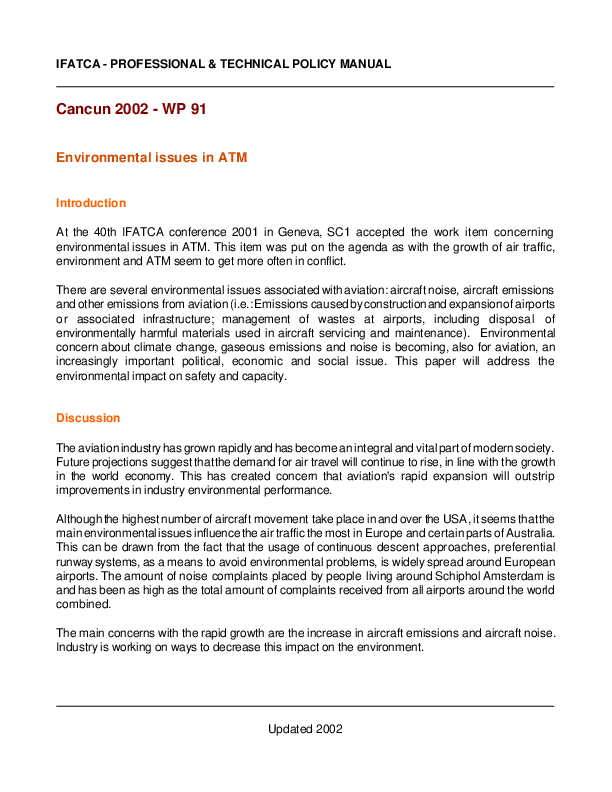 IFATCA - Professional & Technical Policy Manual - Cancun 2002 - WP 91 - Environmental Issues in ATM