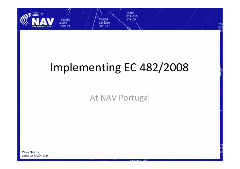 This presentation aims to share the way NAV Portugal is following for the implementation of regulation EC 482/2008, the prerequisites for its implementation, the achievements and the on-going work.