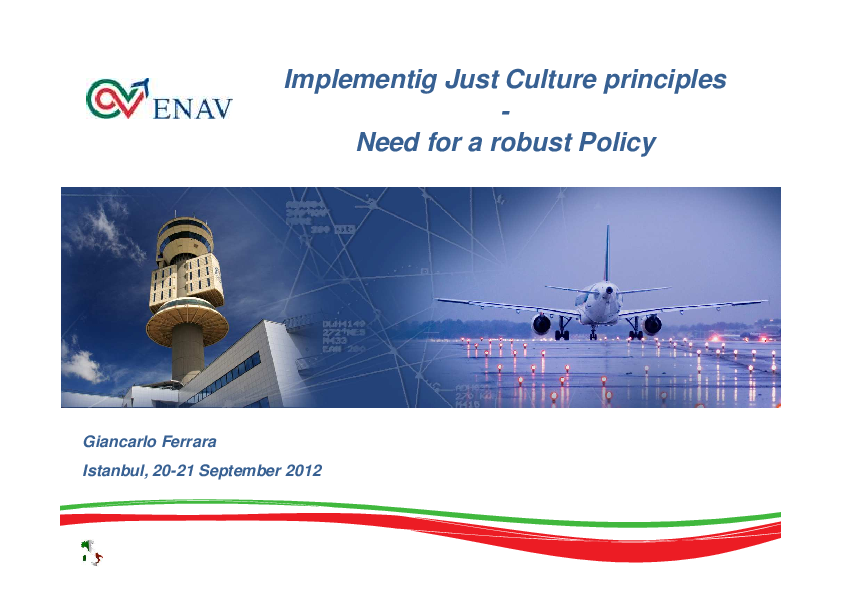 This presentations describes how ENAV managed to implement Just Culture in its organisation and especially the ENAV Just Culture Policy.