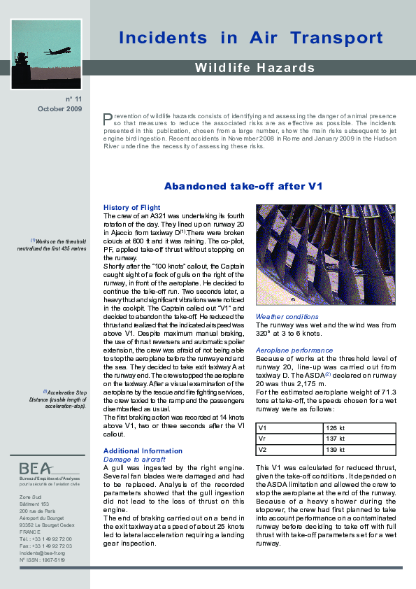 Prevention of wildlife hazards consists of identifying and assessing the danger of animal presence so that measures to reduce the associated risks are as effective as possible. The incidents presented in this publication, chosen from a large number, show the main risks subsequent to jet engine bird ingestion.