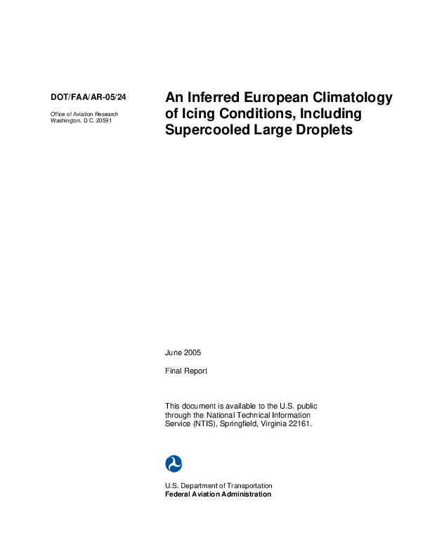 U.S. Department of Transport, Office of Aviation Research, Report No. DOT/FAA/AR-05/24 The need for new regulations concerning flight into supercooled large droplet (SLD) icing conditions is currently under consideration. One aspect of determining the need for such regulations is to assess frequency of occurrence, spatial distribution, temporal distribution, and extent of icing conditions, including those from SLD. Little information on these topics is available, due to a lack of regular, direct measurements. Research aircraft provide in situ observations, but the sample set is small and can be biased. Other techniques must be used to infer the presence of such conditions to create a more unbiased climatology. Their presence and absence can be inferred using surface weather observations in conjunction with vertical profiles of temperature and moisture. Such a technique was successfully undertaken for the North American continent. In this study, a similar climatology of icing and SLD was created for Europe and surrounding areas using 15 years of coincident, 12-hour surface weather reports and balloon-borne soundings. Icing conditions were found to be most common across northern and central Europe, especially over Scandinavia, Germany, and nearby locales. SLD was most common over the northern portions of the continent. Prime locations mostly moved latitudinally and vertically with changes in season. Most events appeared to occur below 15,000 ft. SLD events were typically less than 2000 ft deep and formed via the nonclassical mechanism.