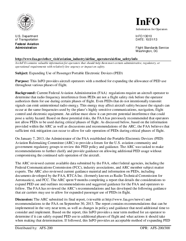 InFO 13010 Expanding Use of Passenger Portable Electronic Devices (PED)