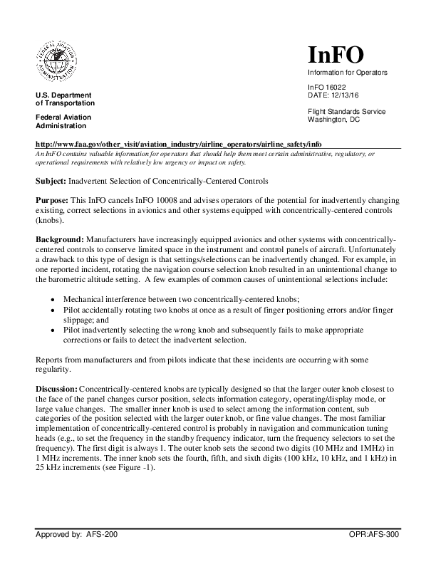 This InFO advises operators of the potential for inadvertently changing existing, correct selections in avionics and other systems equipped with concentrically-centered controls (knobs).