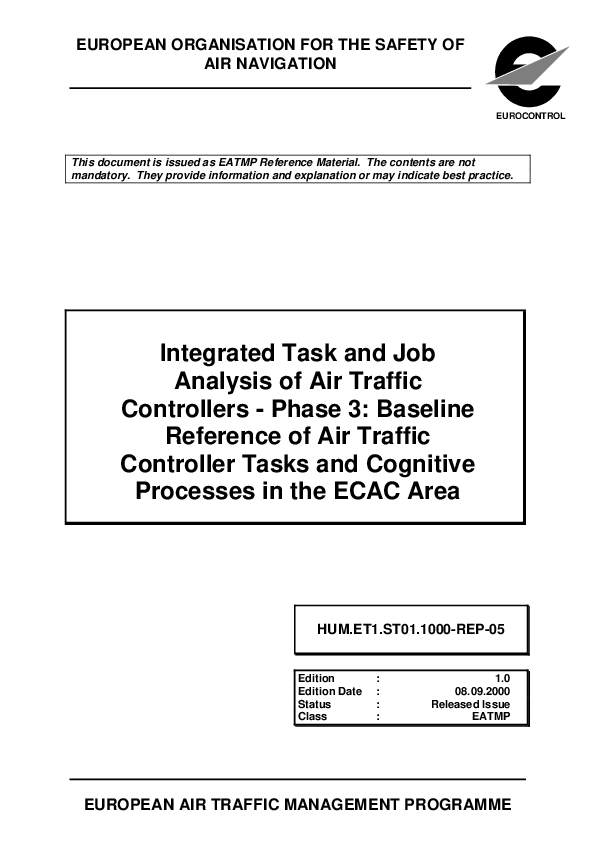 Full Title: Integrated Task and Job Analysis of Air Traffic Controllers - Phase 3: Baseline Reference of Air Traffic Controller Tasks and Cognitive Processes in the ECAC Area. This report presents the results from the Air Traffic Controllers' (ATCOs') task analysis conducted in fifteen different Units in European Civil Aviation Conference (ECAC) States using the Integrated Task Analysis (ITA) methods. The cognitive processes of aerodrome, arrival/departure and en-route controllers are depicted. A new concept, the cognitive profile', was developed in order to allow comparison from the cognitive point of view between the different types of Air Traffic Services (ATS) provision. Additional results on working style, behavioural observation, stress and strain are also provided. Finally, some ideas for potential use of the results in controllers' selection and training, and the development of new ATM system are suggested.