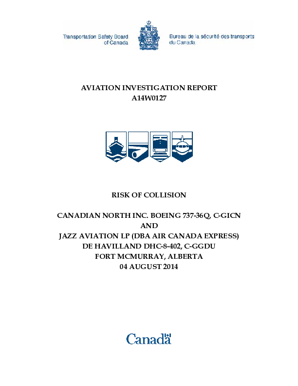 Investigation Report A14W0127 Risk of Collision B733 / DH4D, Fort McMurray Canada, 2014