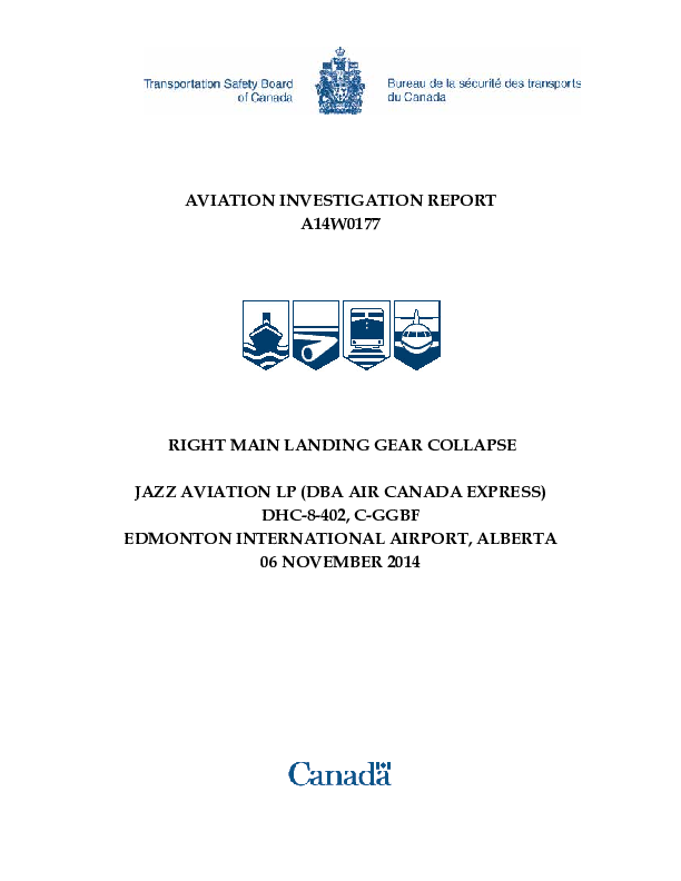 Investigation Report A14W0177 Right MLG Collapse DH8D (C-GGBF), Edmonton, AB, Canada 6/11/14