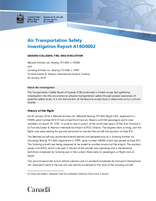 Investigation Report A18P0042: B738 (C-FDMB) & B738 (C-FPRP), Toronto Canada, 5 Jan 2018