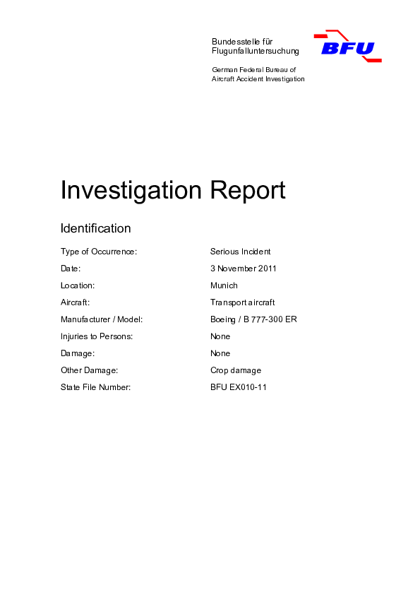 Investigation Report BFU EX010-11: B773 (9V-SWQ) Munich Germany 3 Nov 2011