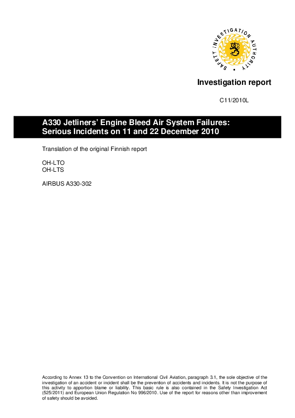 On 22 December 2010, a Finnair Airbus A330-300 inbound to Helsinki and cruising in very cold air at an altitude of 11,600 metres lost cabin pressurisation in cruise flight and completed an emergency descent before continuing the originally intended flight at a lower level. The subsequent Investigation was carried out together with that into a similar occurrence to another Finnair A330 which had occurred 11 days earlier. It was found that in both incidents, both engine bleed air systems had failed to function normally because of a design fault which had allowed water within their pressure transducers to freeze.