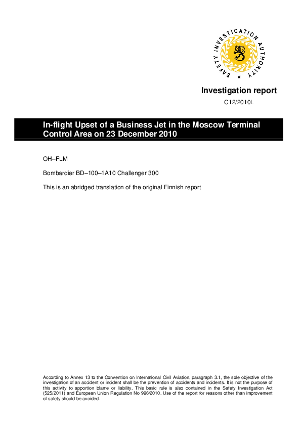 Investigation Report C12/2010L: In-flight Upset of a Business Jet in the Moscow Terminal Control Are