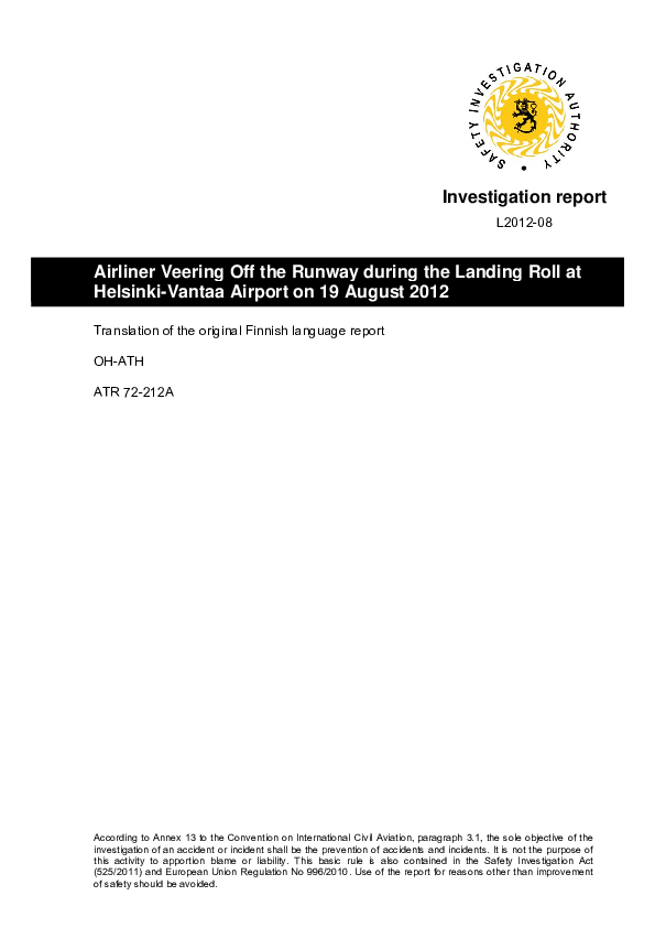 Investigation report L2012-08, AT72 runway excursion, Helsinki-Vantaa Airport on 19 August 2012