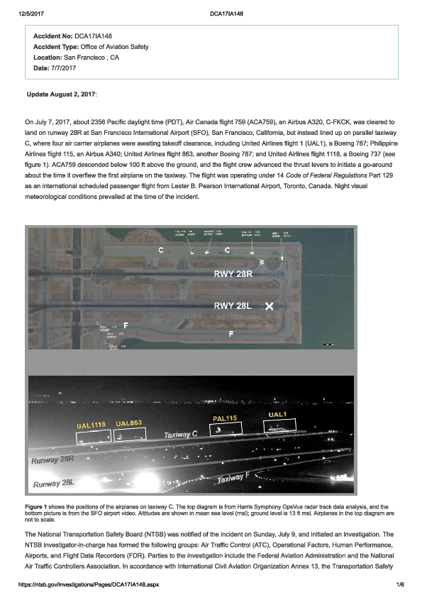 Landing Approach to Taxiway at San Francisco International Airport (SFO). On 7 July 2017, an Air Canada Airbus A319 crew unintentionally made and almost completed a night visual final approach to the taxiway parallel to the runway on which they had been cleared to land at San Francisco. Despite seeing lights ahead on what they presumed was the runway, they continued the approach descending over the taxiway and overhead two aircraft on it which were awaiting full length departures before commencing a go around at approximately 85 feet agl and reaching a minimum height of 59 feet agl before beginning to climb away. The NTSB is conducting an Investigation.