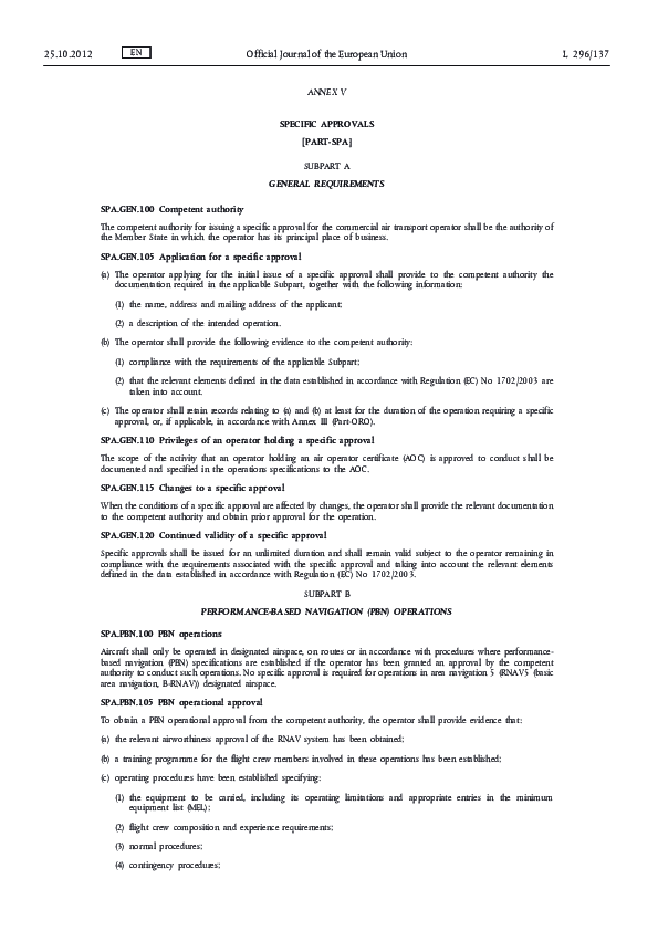 Specific Approvals - contains requirements for specific approvals, such as PBN, MNPS,, RVSM, LVO, ETOPS, DG, and certain specified helicopter operations.