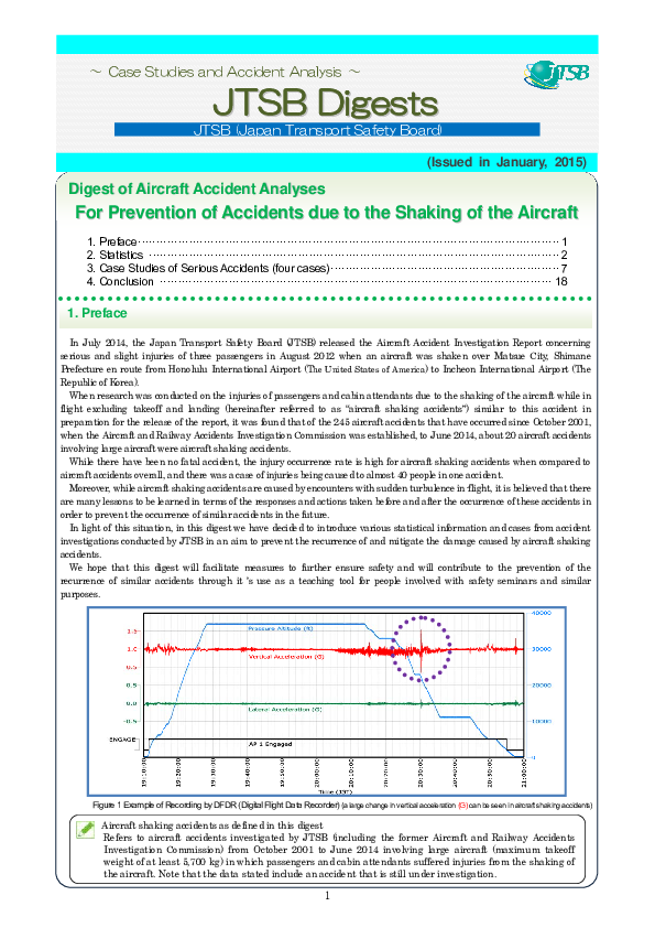 in this digest the JTSB introduce various statistical information and cases from accident investigations conducted by JTSB in an aim to prevent the recurrence of and mitigate the damage caused by aircraft shaking (turbulence) accidents.