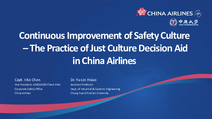 Presentation at the Air Safety Summit in 2019 on the continuous improvement of safety culture and the practice of just culture decision aid in China Airlines