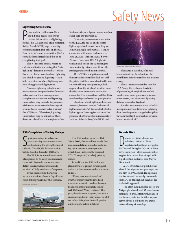 Safety News from AeroSafety World June 2012 edition. NTSB calls for greater access to Lightning detection Network Data.
